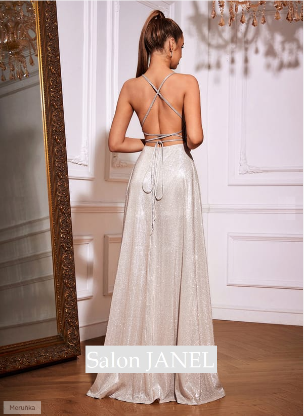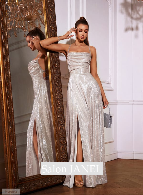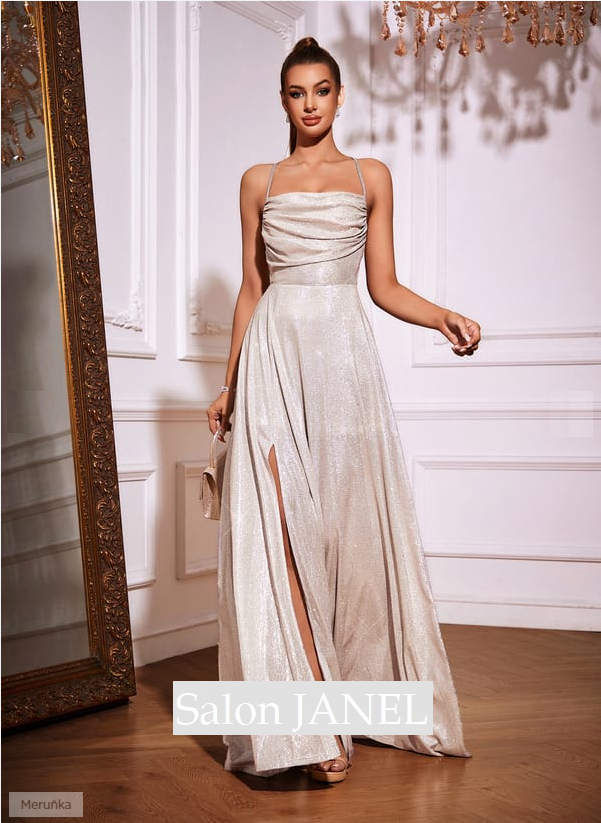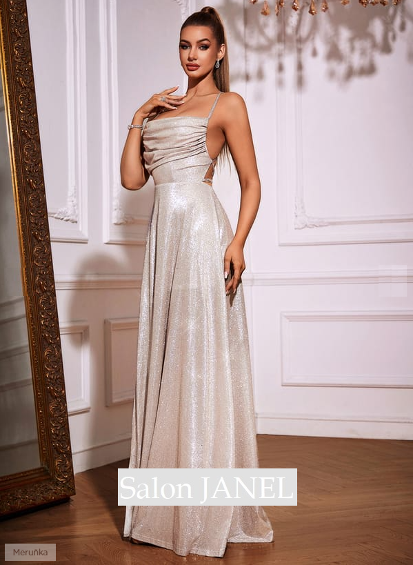 TŘPYTIVÉ PUDROVĚ ZLATÉ STREČOVÉ ŠATY S HOLÝMI ZÁDY