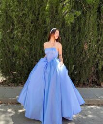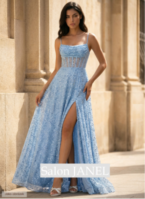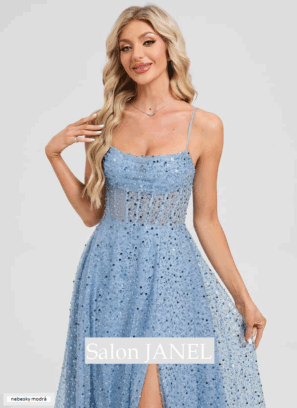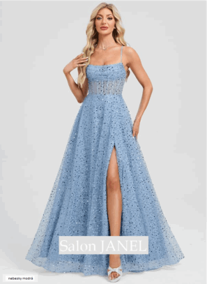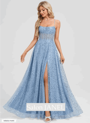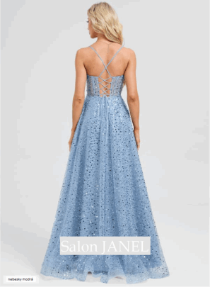 NEBESKY SVĚTLE MODRÉ TŘPYTIVÉ TYLOVÉ ŠATY S KORZETOVÝM ŽIVŮTKEM A ŠNĚROVÁNÍM NA ZÁDECH
