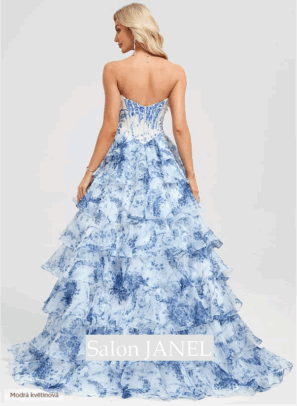 NÁDHERNÉ VOLÁNOVÉ ŠATY Z BÍLO MODRÉ KVĚTINOVÉ ORGANZY S KORZETOVÝM ŽIVŮTKEM A ZIPEM NA ZÁDECH