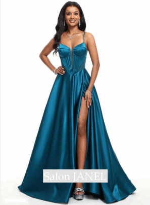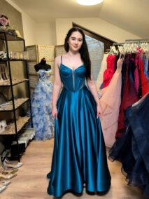 PŘEKRÁSNÉ SATÉNOVÉ ŠATY V MOŘSKÉ MODRO ZELENÉ BARVĚ S KORZETOVÝM ŽIVŮTKEM, HOLÝMI ZÁDY A VYSOKÝM ROZPARKEM