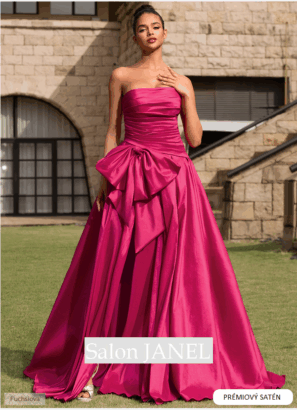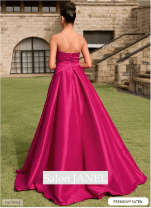 ÚCHVATNÉ FUCHSIOVĚ RŮŽOVÉ ŠATY JSOU UŠITY ZE SATÉNOVÉHO TAFTU, MAJÍ KORZETOVÝ ŽIVŮTEK, BOHATOU KOLOVOU SUKNI A MAŠLI NAD VYSOKÝM ROZPARKEM