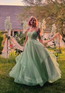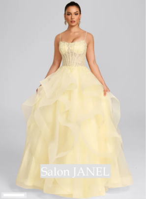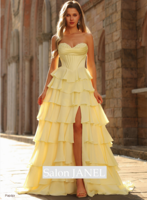 TŘPYTIVÉ TYLOVÉ ŠATY S KORZETOVÝM ŽIVŮTKEM, VRSTVENOU VOLÁNOVOU SUKNÍ A ŠNĚROVÁNÍM NA ZÁDECH