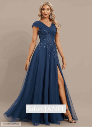 TEMNĚ MODRÉ TYLOVÉ DLOUHÉ ŠATY S VYŠÍVANÝM TŘPYTIVÝM ŽIVŮTKEM