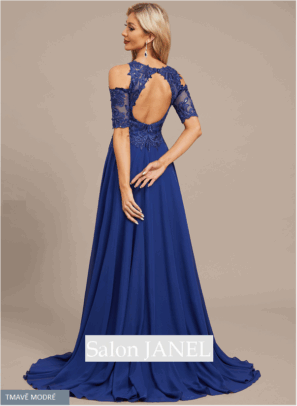 KRÁLOVSKY MODRÉ SPOLEČENSKÉ ŠATY S BÍLOU KRAJKOU, DELŠÍM RUKÁVEM A VÝSTŘIHEM DO V