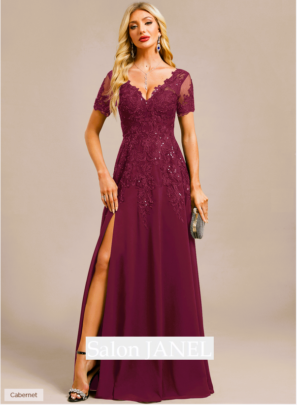 ÚŽASNÉ ŠATY V CABERNET VÍNOVÉ BARVĚ S KRÁTKÝM RUKÁVKEM A VÝSTŘIHEM DO V