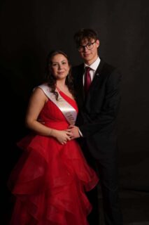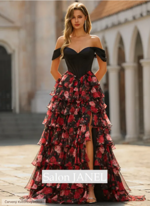 KRÁSNÉ ŠATY NA MATURITNÍ PLES S KORZETOVÝM ŽIVŮTKEM, KVĚTINOVOU KRAJKOU A VYSOKÝM ROZPARKEM