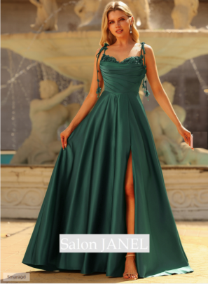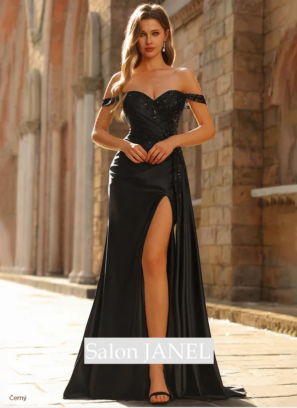 SATÉNOVÉ SPOLEČENSKÉ ŠATY SE SPADLÝMI RAMENY, ROZPARKEM A KAPSAMI