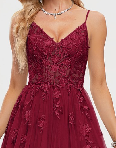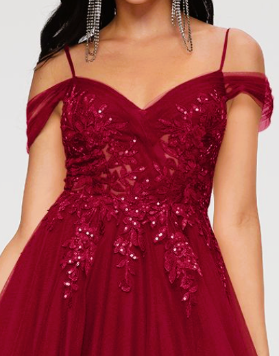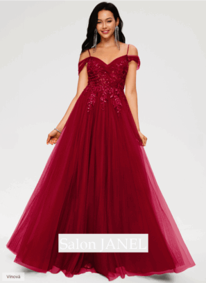 KRÁSNÉ SEXY DLOUHÉ ŠATY SE SPADLÝMI RAMENY A ROZPARKEM Z VYŠÍVANÉHO TYLU S BARVĚ ČERVENÝCH HROZNŮ