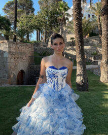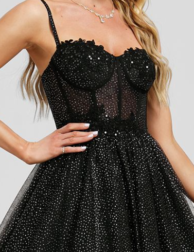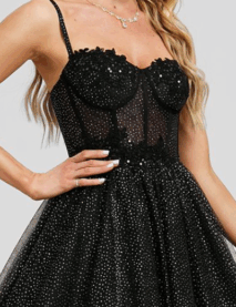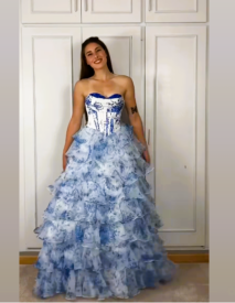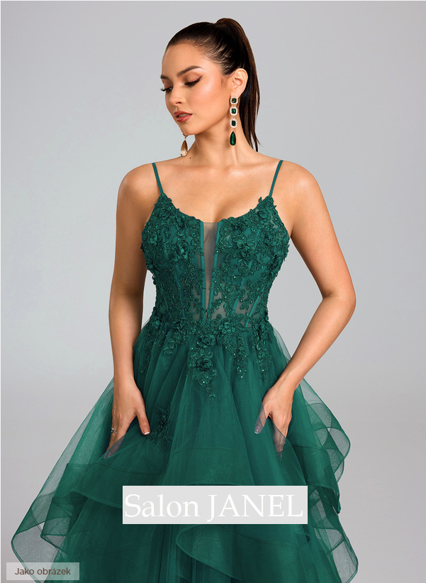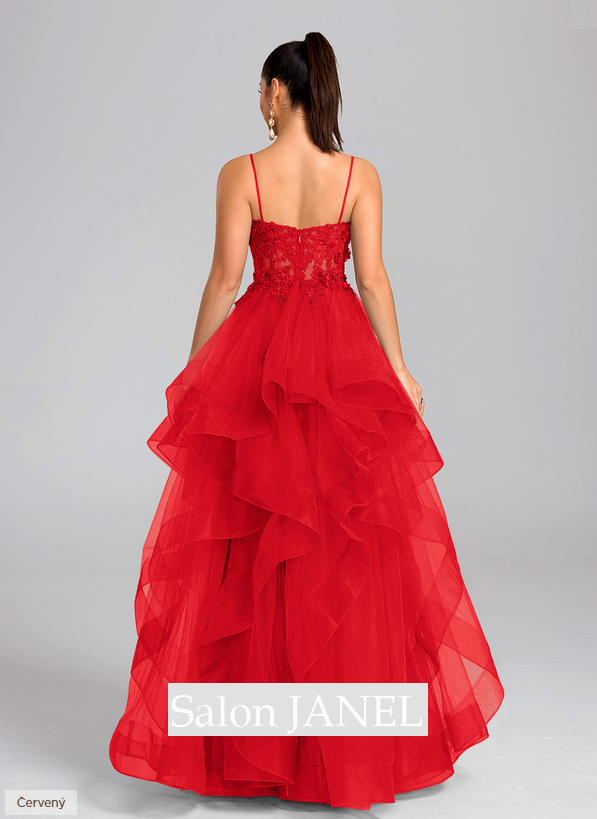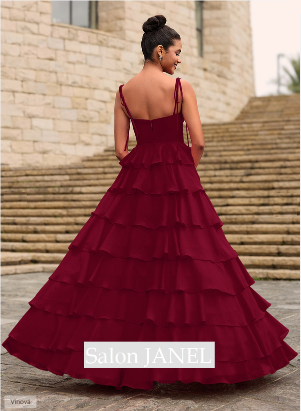 TŘPYTIVÉ TYLOVÉ ŠATY S KORZETOVÝM ŽIVŮTKEM, VRSTVENOU VOLÁNOVOU SUKNÍ A  ŠNĚROVÁNÍM NA ZÁDECH