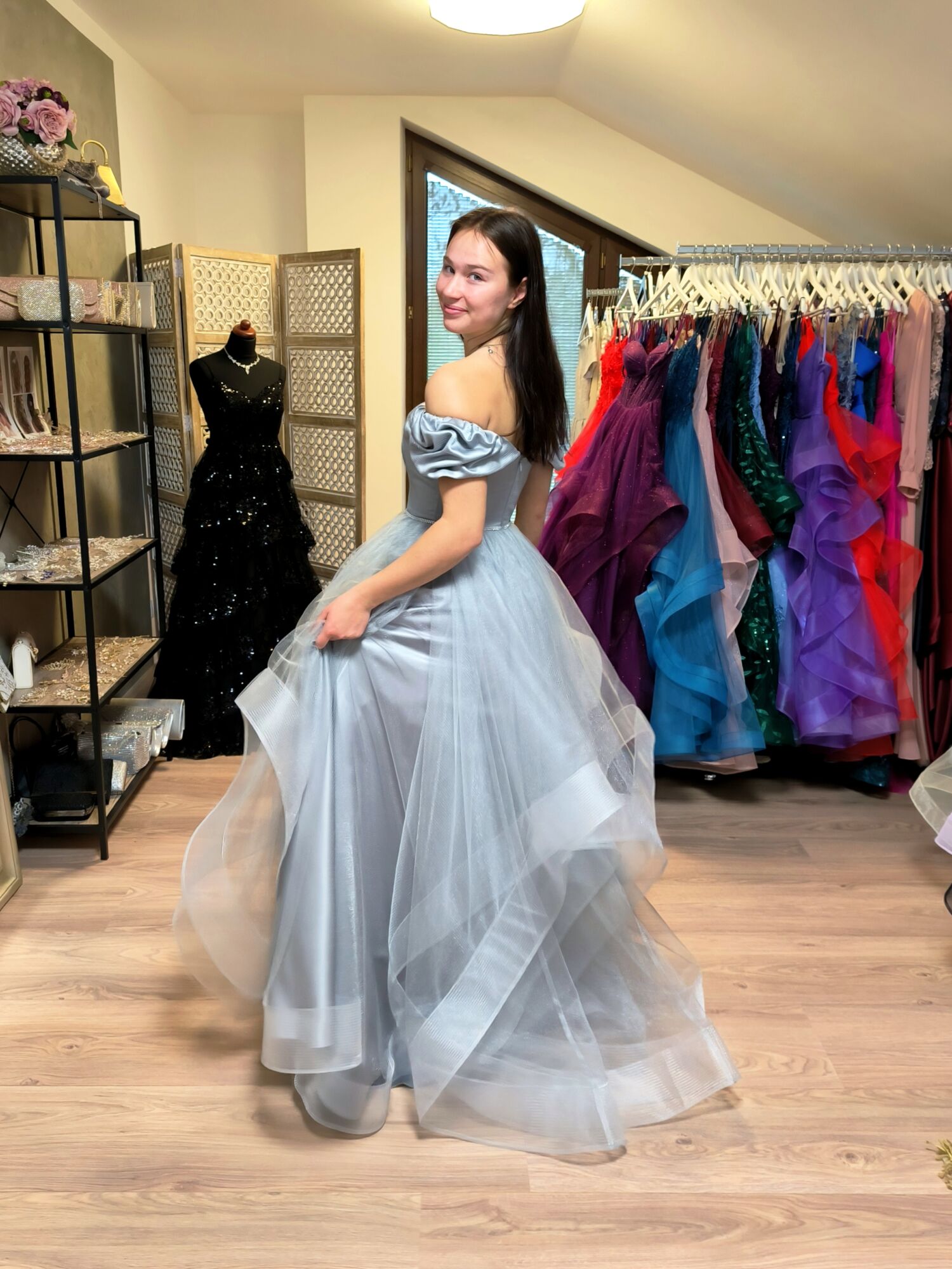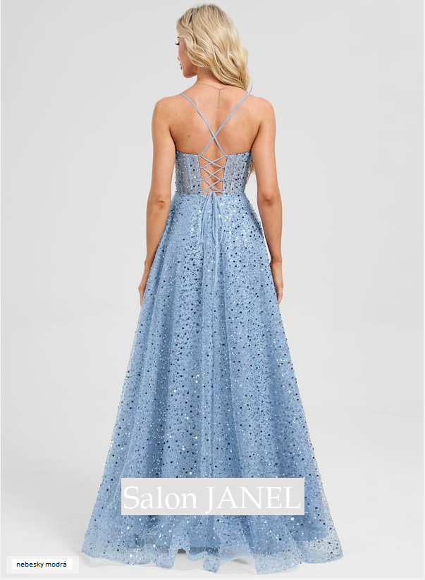 NEBESKY SVĚTLE MODRÉ TŘPYTIVÉ TYLOVÉ ŠATY S KORZETOVÝM ŽIVŮTKEM A ŠNĚROVÁNÍM NA ZÁDECH