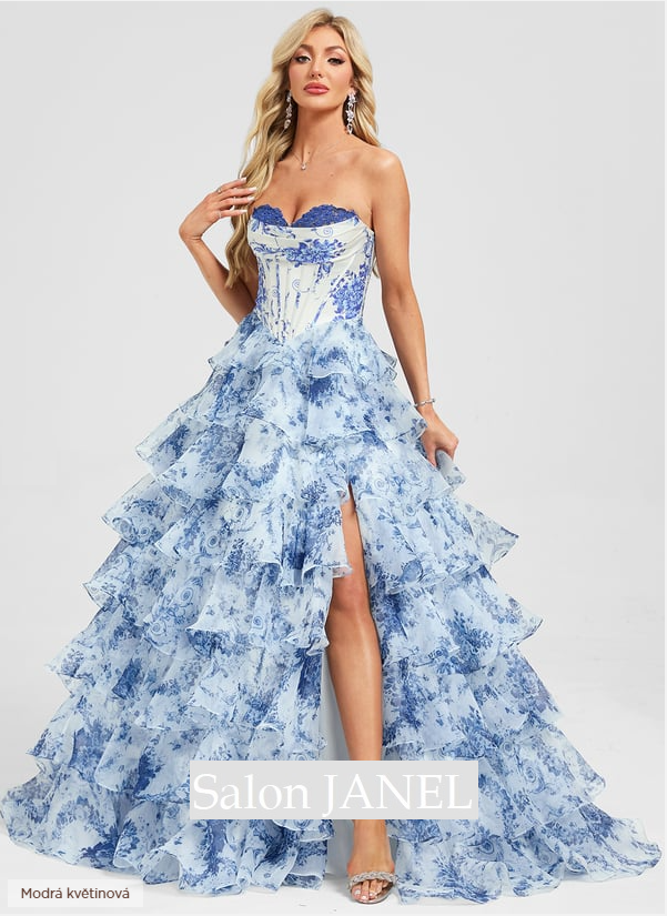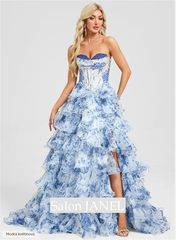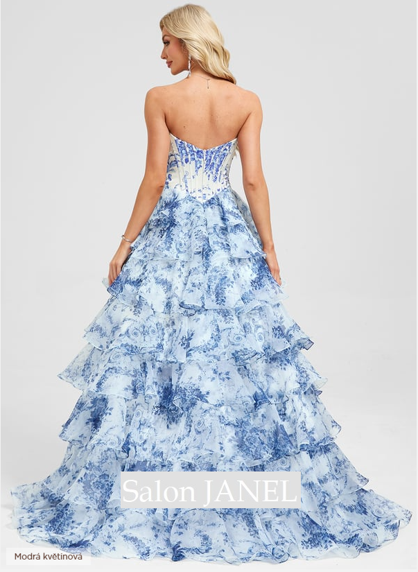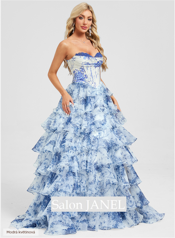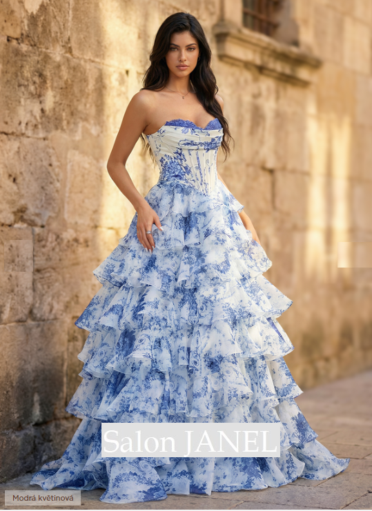 NÁDHERNÉ VOLÁNOVÉ ŠATY Z BÍLO MODRÉ KVĚTINOVÉ ORGANZY S KORZETOVÝM ŽIVŮTKEM A ZIPEM NA ZÁDECH
