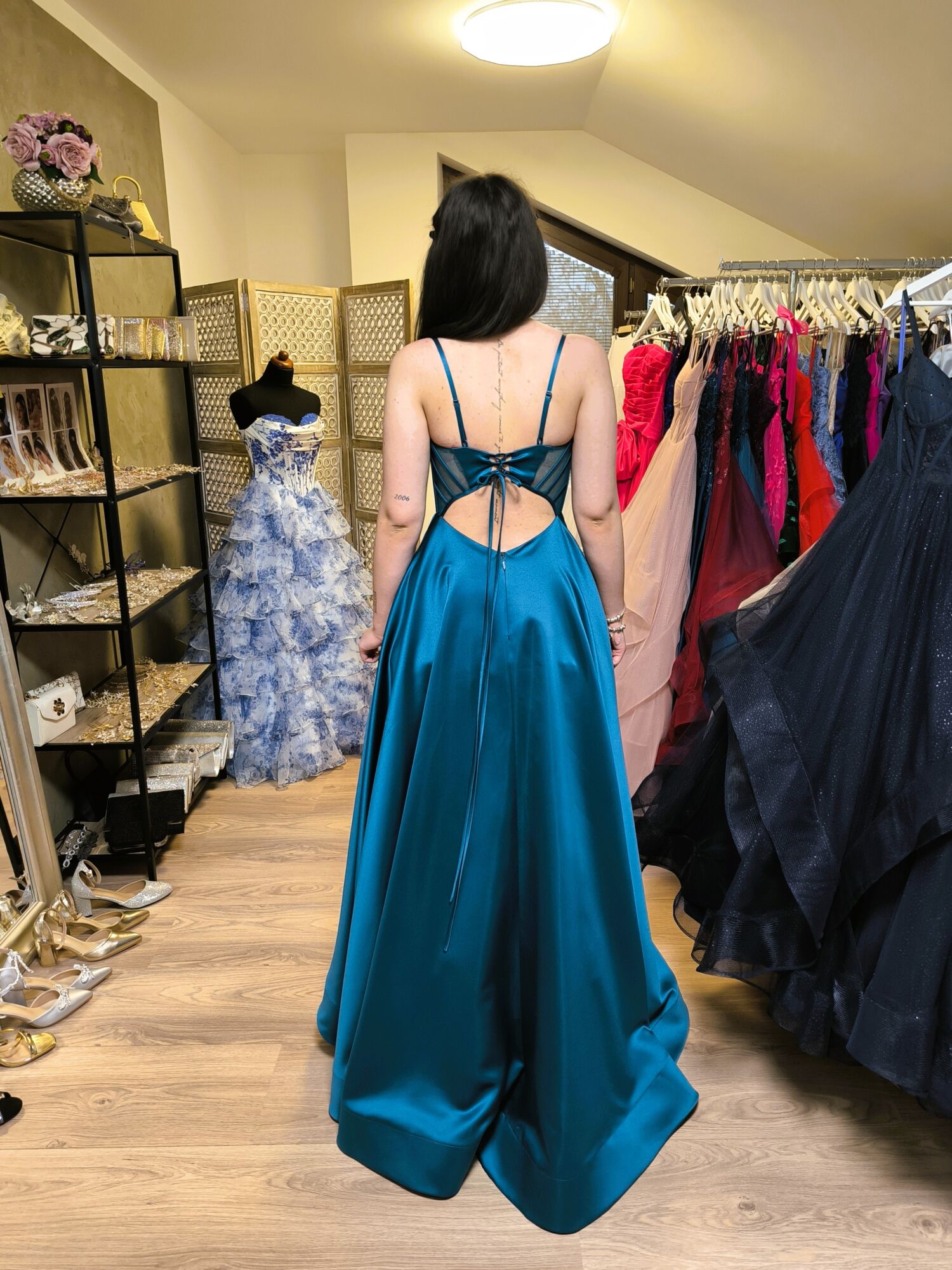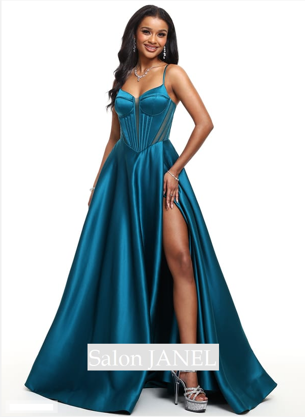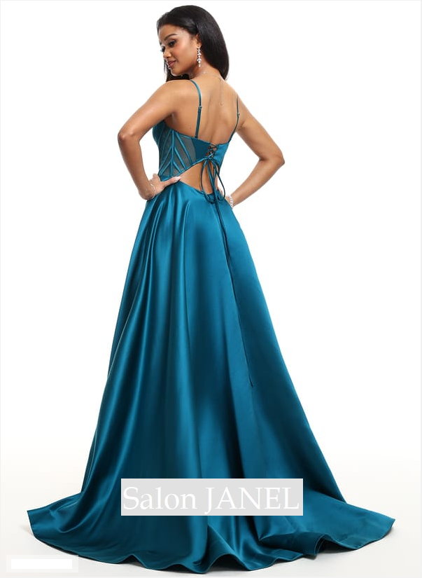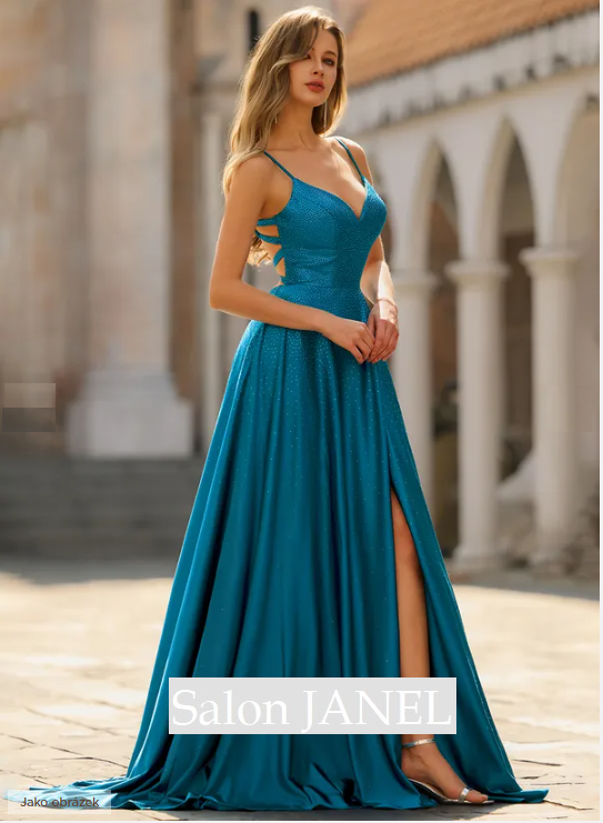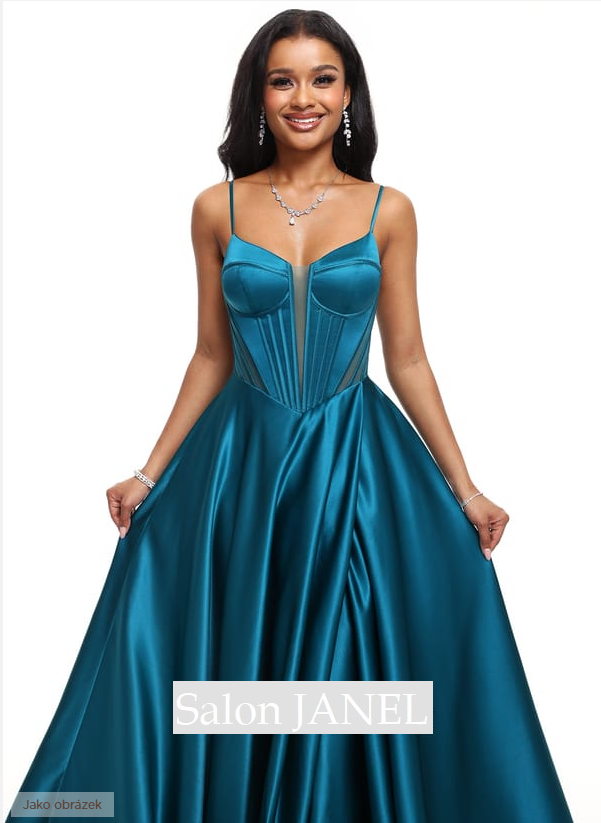 PŘEKRÁSNÉ SATÉNOVÉ ŠATY V MOŘSKÉ MODRO ZELENÉ BARVĚ S KORZETOVÝM ŽIVŮTKEM, HOLÝMI ZÁDY A VYSOKÝM ROZPARKEM