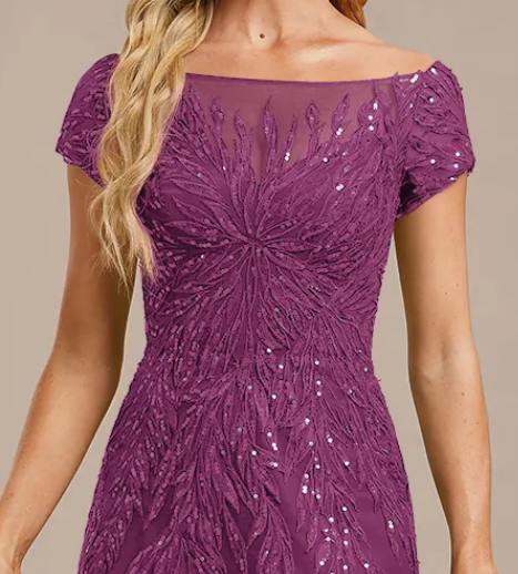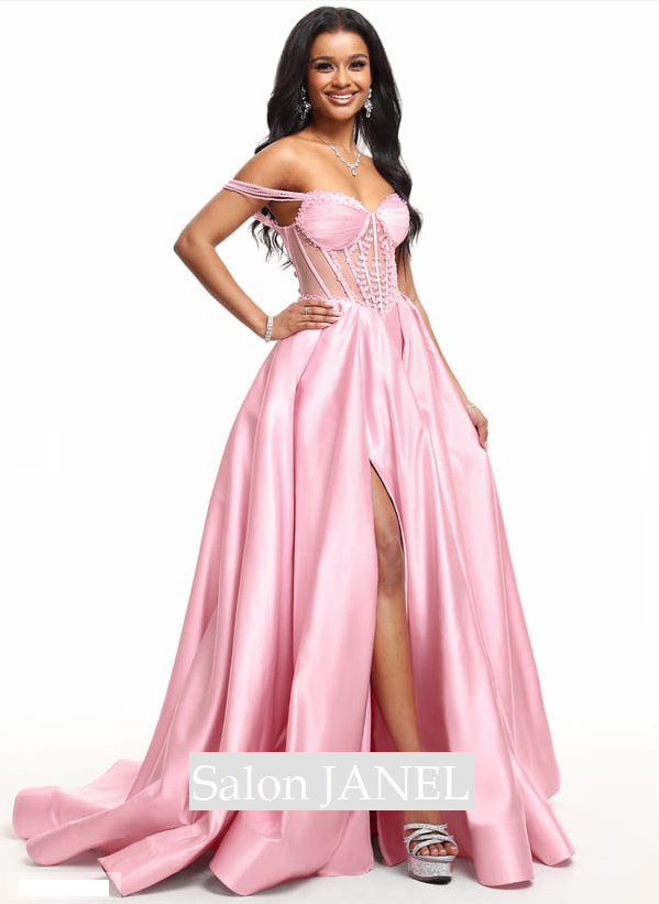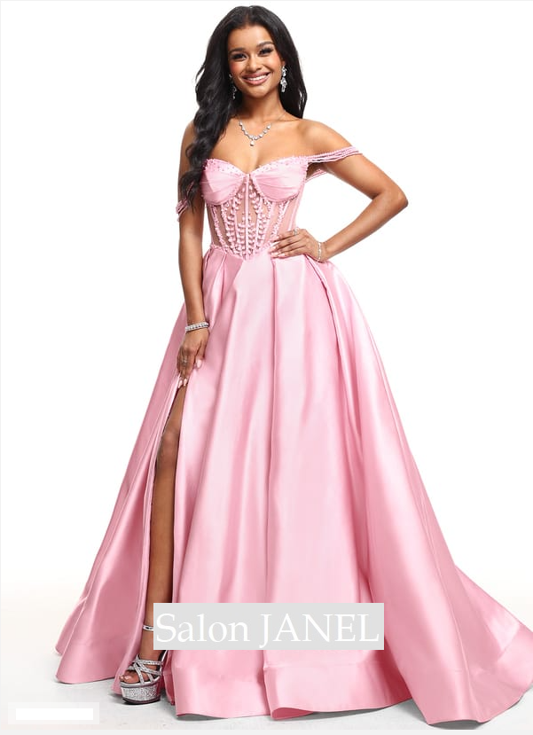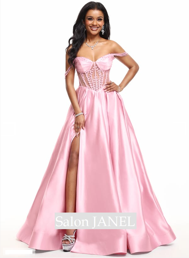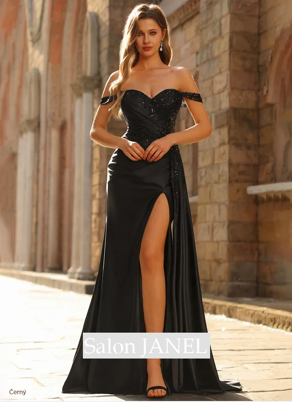 SATÉNOVÉ SPOLEČENSKÉ ŠATY SE SPADLÝMI RAMENY, ROZPARKEM A KAPSAMI