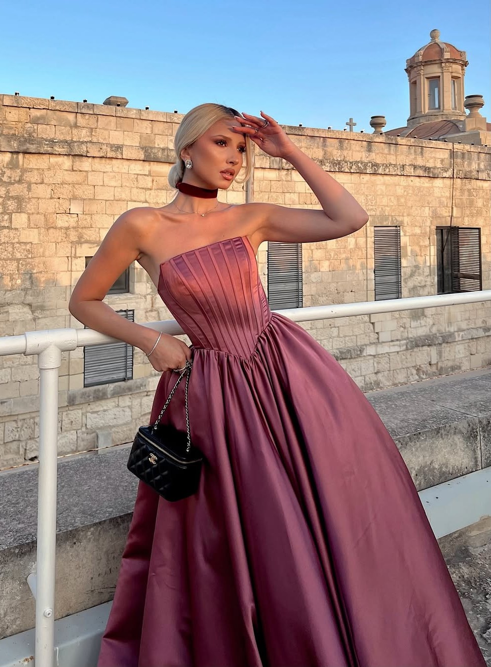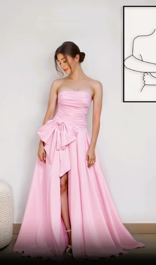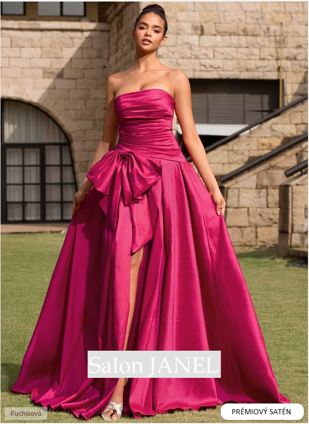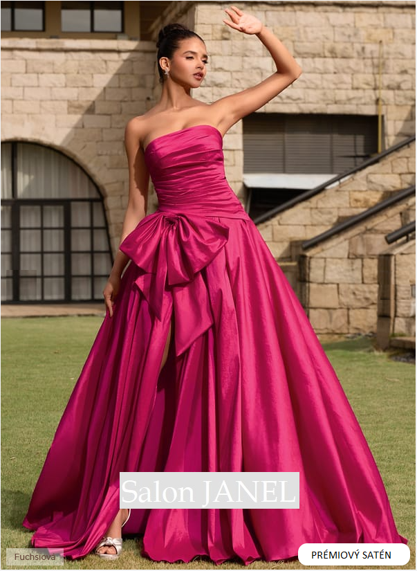 ÚCHVATNÉ FUCHSIOVĚ RŮŽOVÉ ŠATY JSOU UŠITY ZE SATÉNOVÉHO TAFTU, MAJÍ KORZETOVÝ ŽIVŮTEK, BOHATOU KOLOVOU SUKNI A MAŠLI NAD VYSOKÝM ROZPARKEM