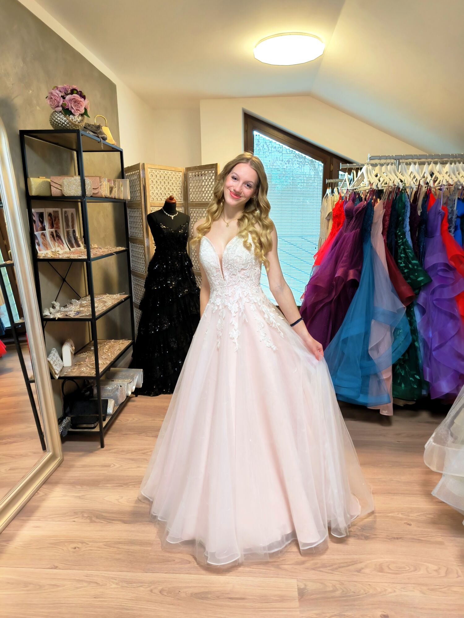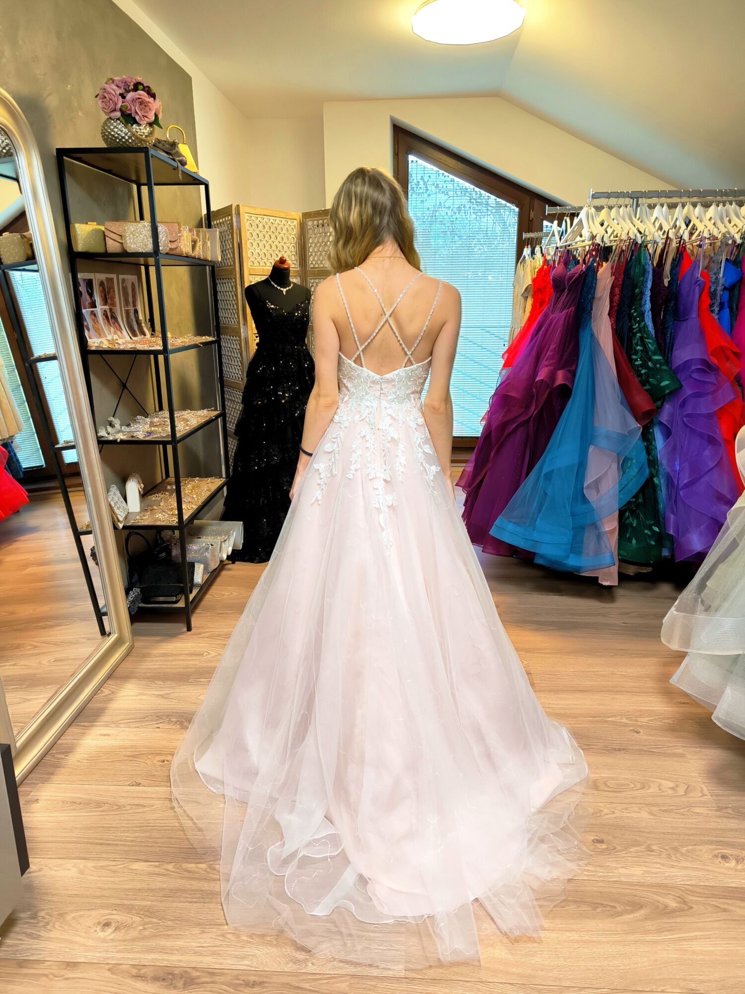 PŘEKRÁSNÉ ŠATY Z VYŠÍVANÉHO TYLU V RŮŽOVĚ PERLEŤOVÉ BARVĚ A ŠNĚROVÁNÍM NA ZÁDECH
