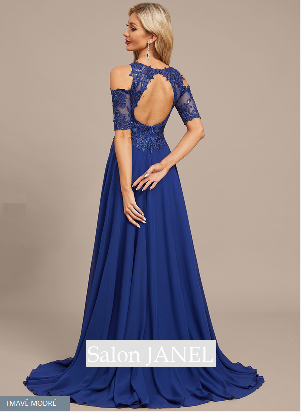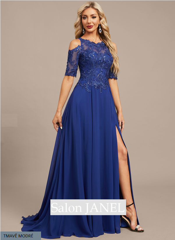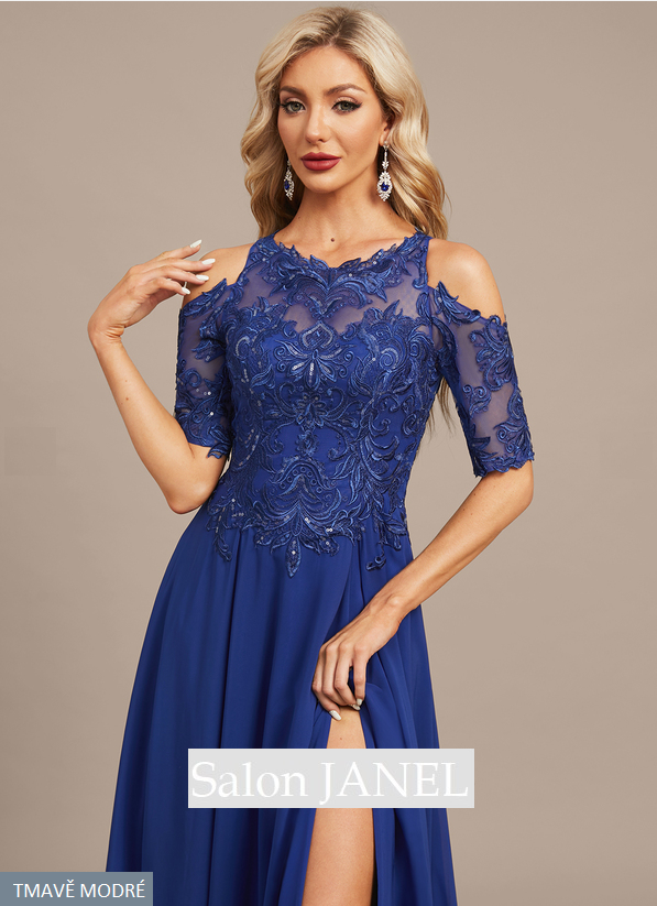 KRÁLOVSKY MODRÉ SPOLEČENSKÉ ŠATY S BÍLOU KRAJKOU, DELŠÍM RUKÁVEM A VÝSTŘIHEM DO V