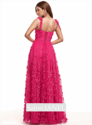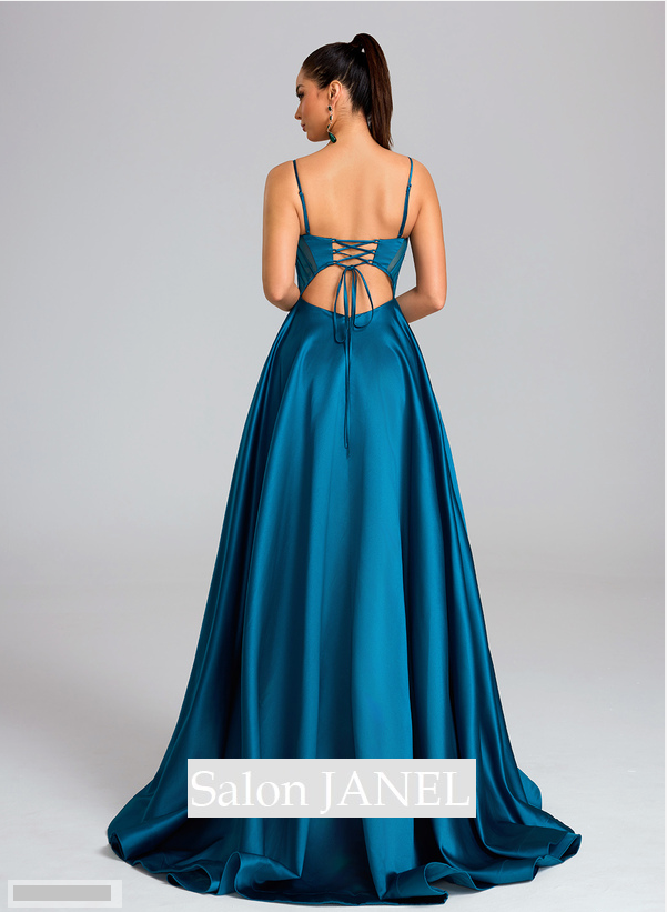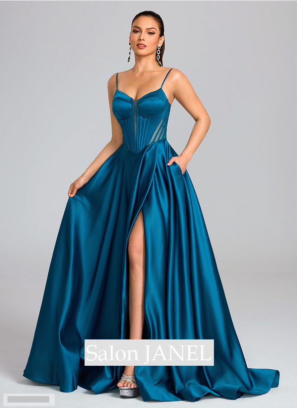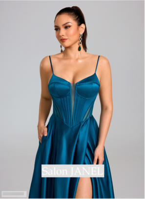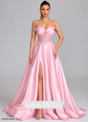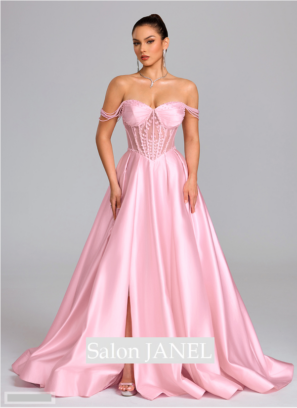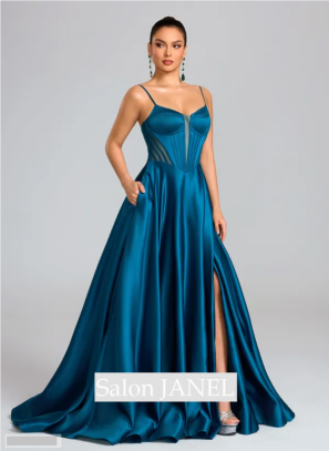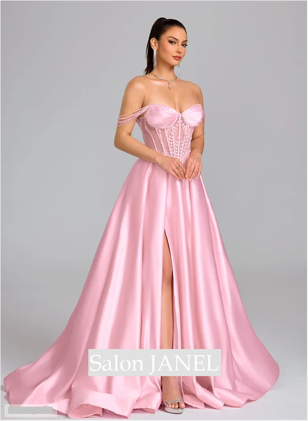 SATÉNOVÉ SPOLEČENSKÉ ŠATY SE SPADLÝMI RAMENY, ROZPARKEM A KAPSAMI