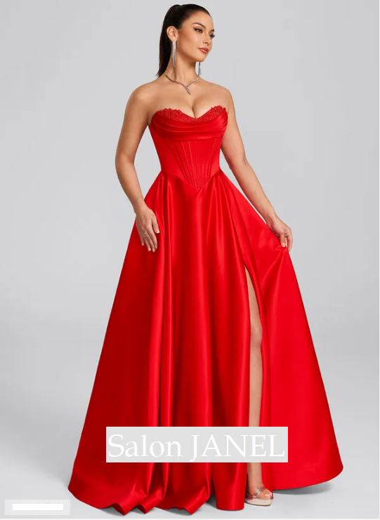 KRÁSNÉ ŠATY NA MATURITNÍ PLES S KORZETOVÝM ŽIVŮTKEM, KVĚTINOVOU KRAJKOU A VYSOKÝM ROZPARKEM