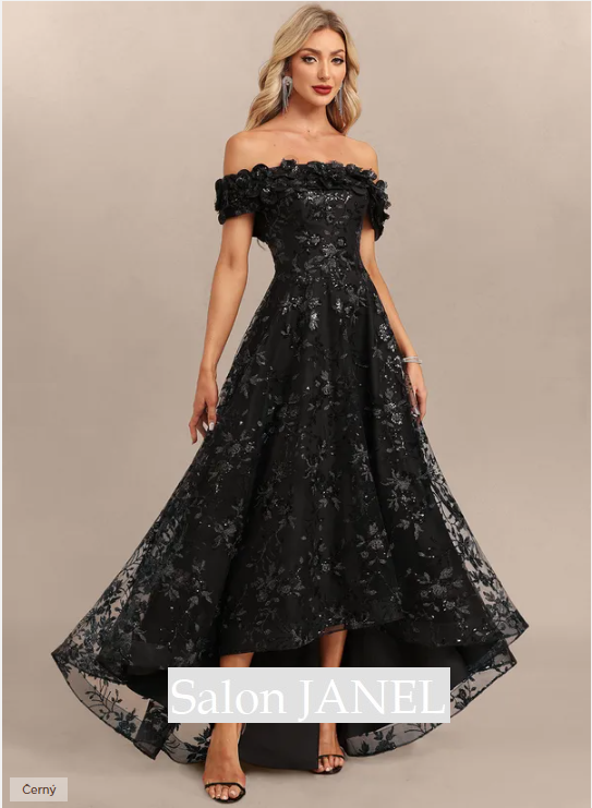 TŘPYTIVÉ ČERNÉ DLOUHÉ ŠATY Z VYŠÍVANÉHO TYLU S HOLÝMI ZÁDY