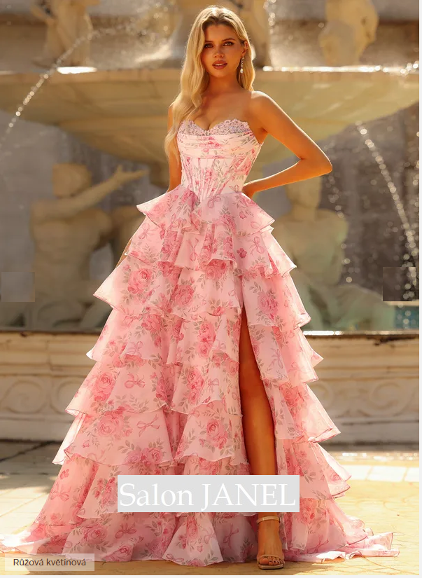 TŘPYTIVÉ TYLOVÉ ŠATY S KORZETOVÝM ŽIVŮTKEM, VRSTVENOU VOLÁNOVOU SUKNÍ A ŠNĚROVÁNÍM NA ZÁDECH