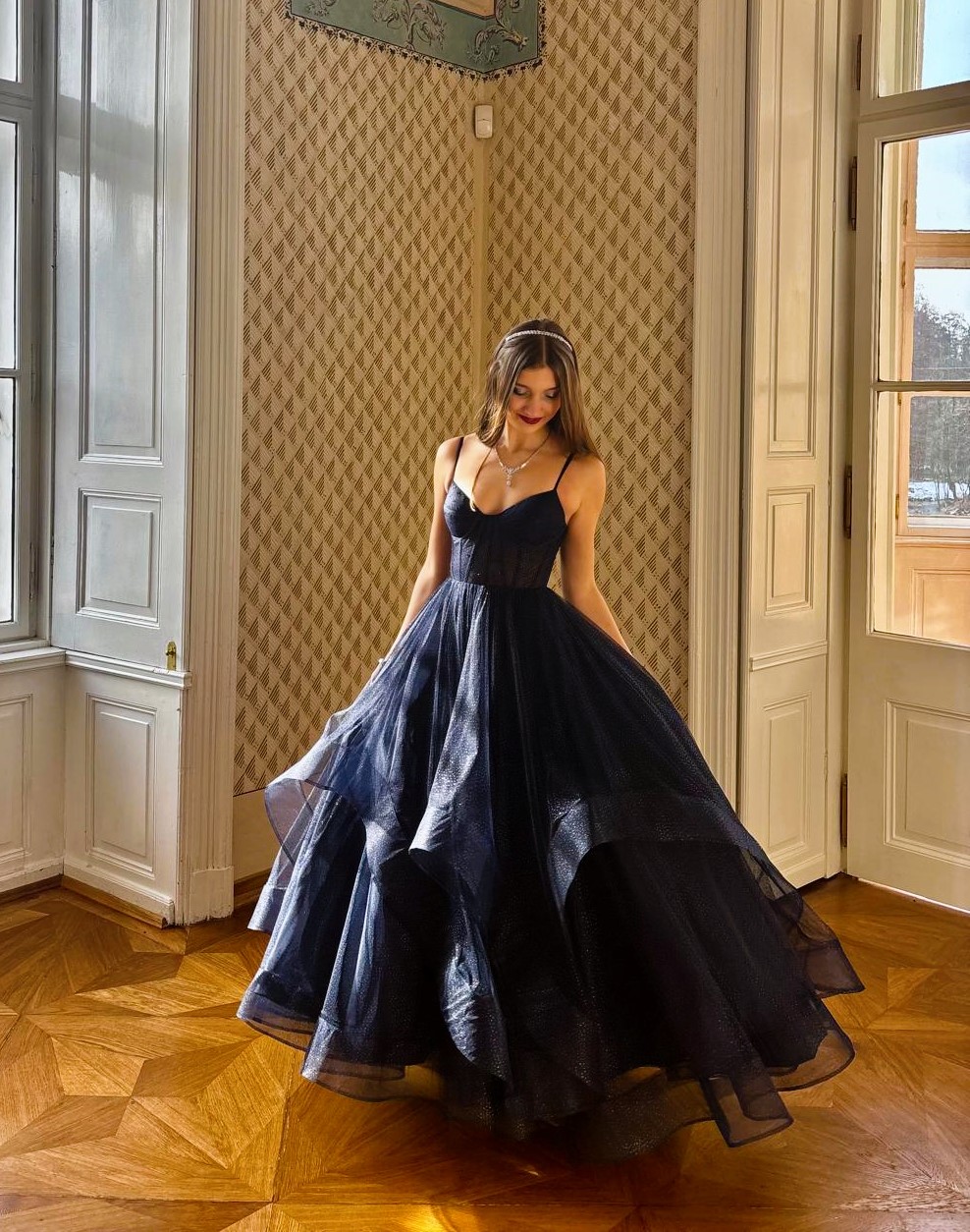 TEMNĚ MODRÉ TYLOVÉ DLOUHÉ ŠATY S VYŠÍVANÝM TŘPYTIVÝM ŽIVŮTKEM