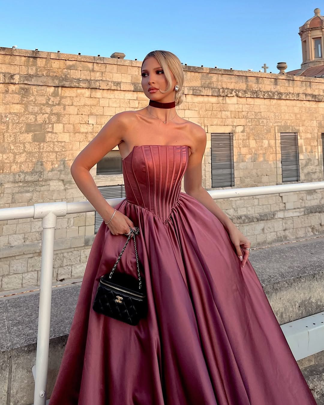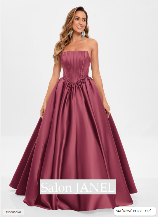 PŘEKRÁSNÉ SATÉNOVÉ MORUŠOVÉ ŠATY S BOHATOU DLOUHOU SUKNÍ A KORZETOVÝM ŽIVŮTKEM